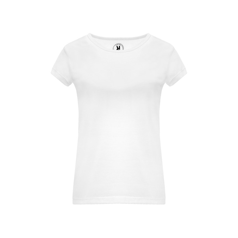 Camiseta de mujer de manga corta de diseño entallado con cuello redondo ribeteado en el mismo tejido y costuras laterales. Tejido de poliéster con tacto algodón.
