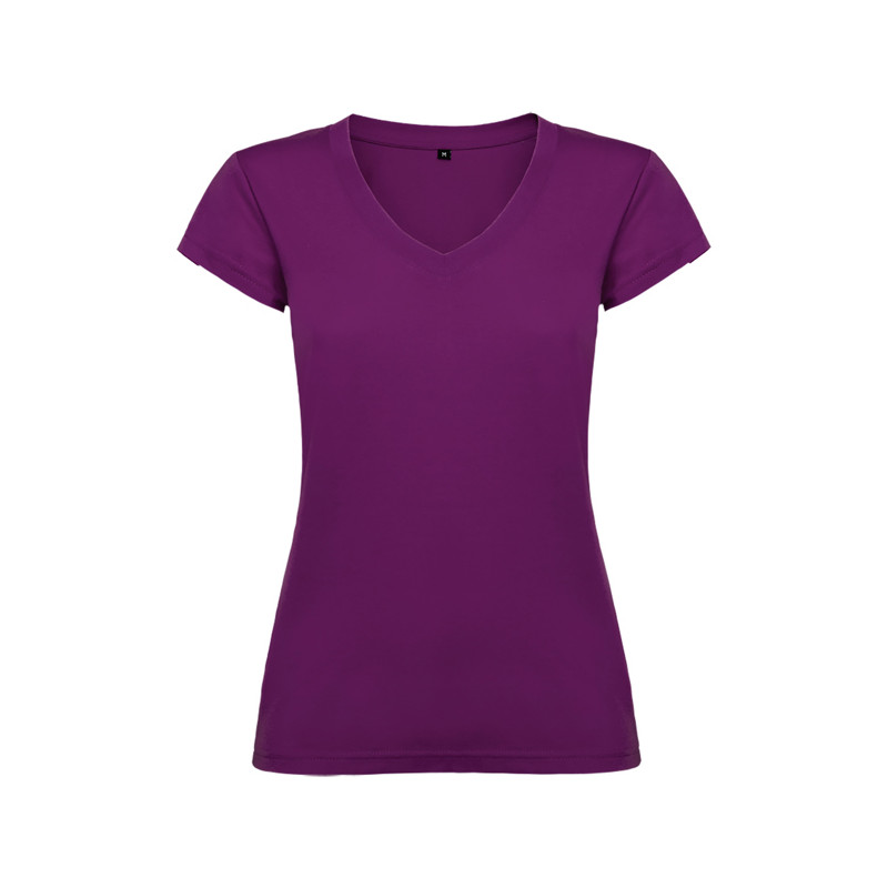 Camiseta de mujer con manga corta, escote en cuello de pico y acabados en ribete acanalado. Corte entallado con costuras laterales.